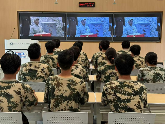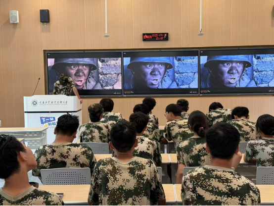本次活动通过扫描二维码进群填报信息的方式报名,观影当天新生们凭报名信息在指定场地有序签到入场。活动现场,身着迷彩服的新生们整齐就座,目光聚焦于前方三块大屏上的革命影片画面。影片以革命历史关键节点为背景,生动再现了革命先辈为国家独立、民族解放挺身而出的英雄事迹,那一个个热血镜头、一段段感人故事,让新生们深受触动。
